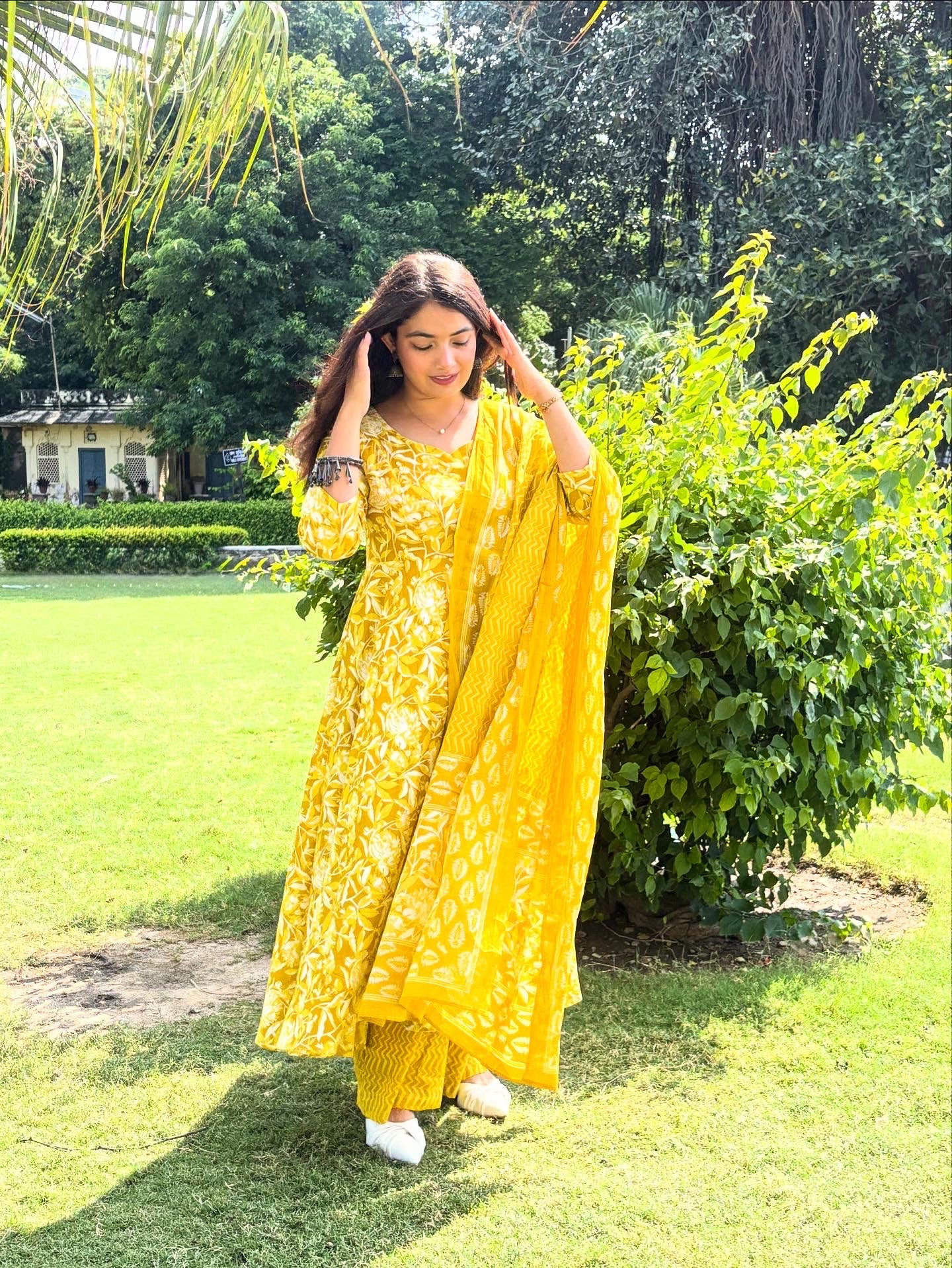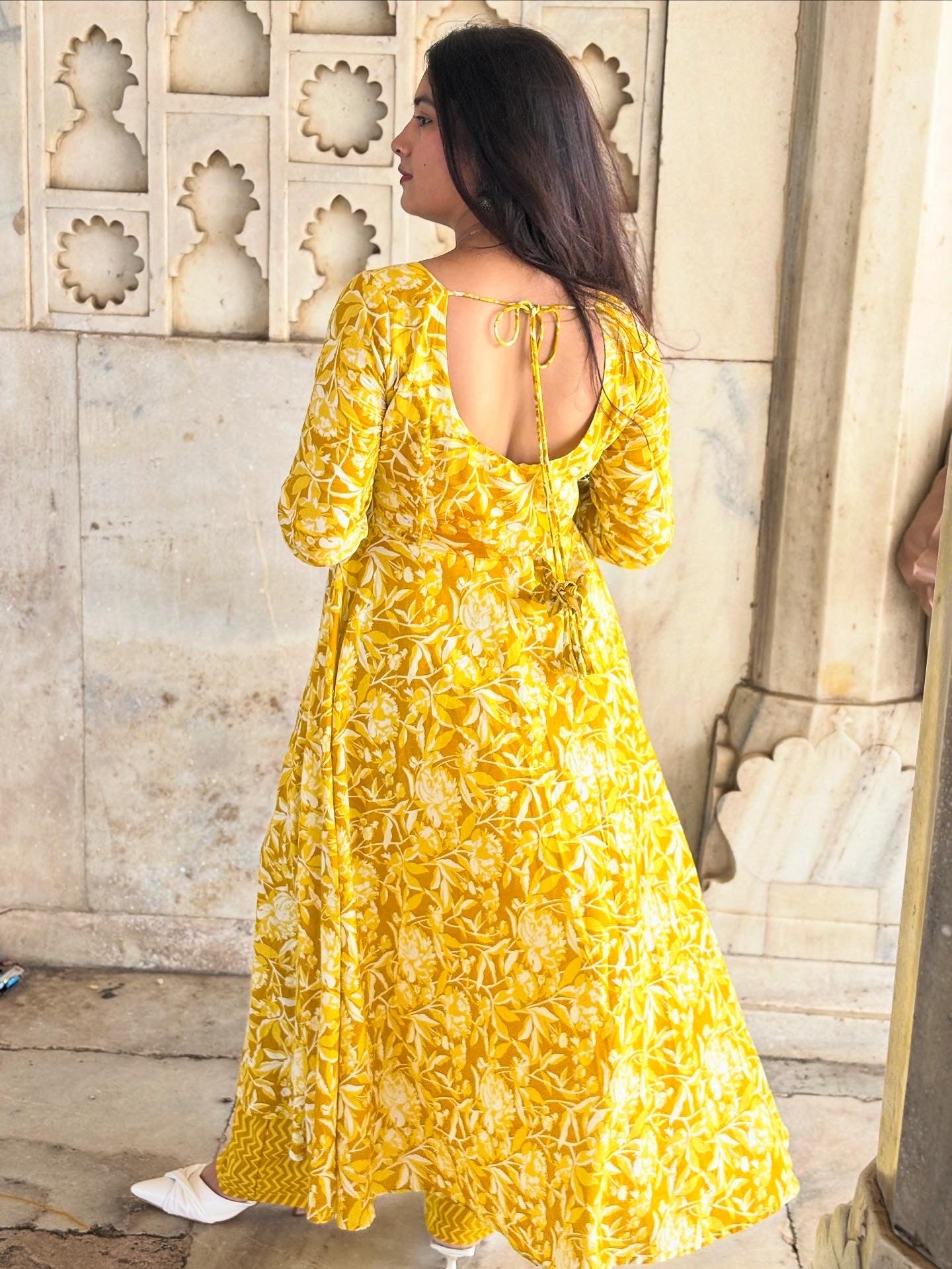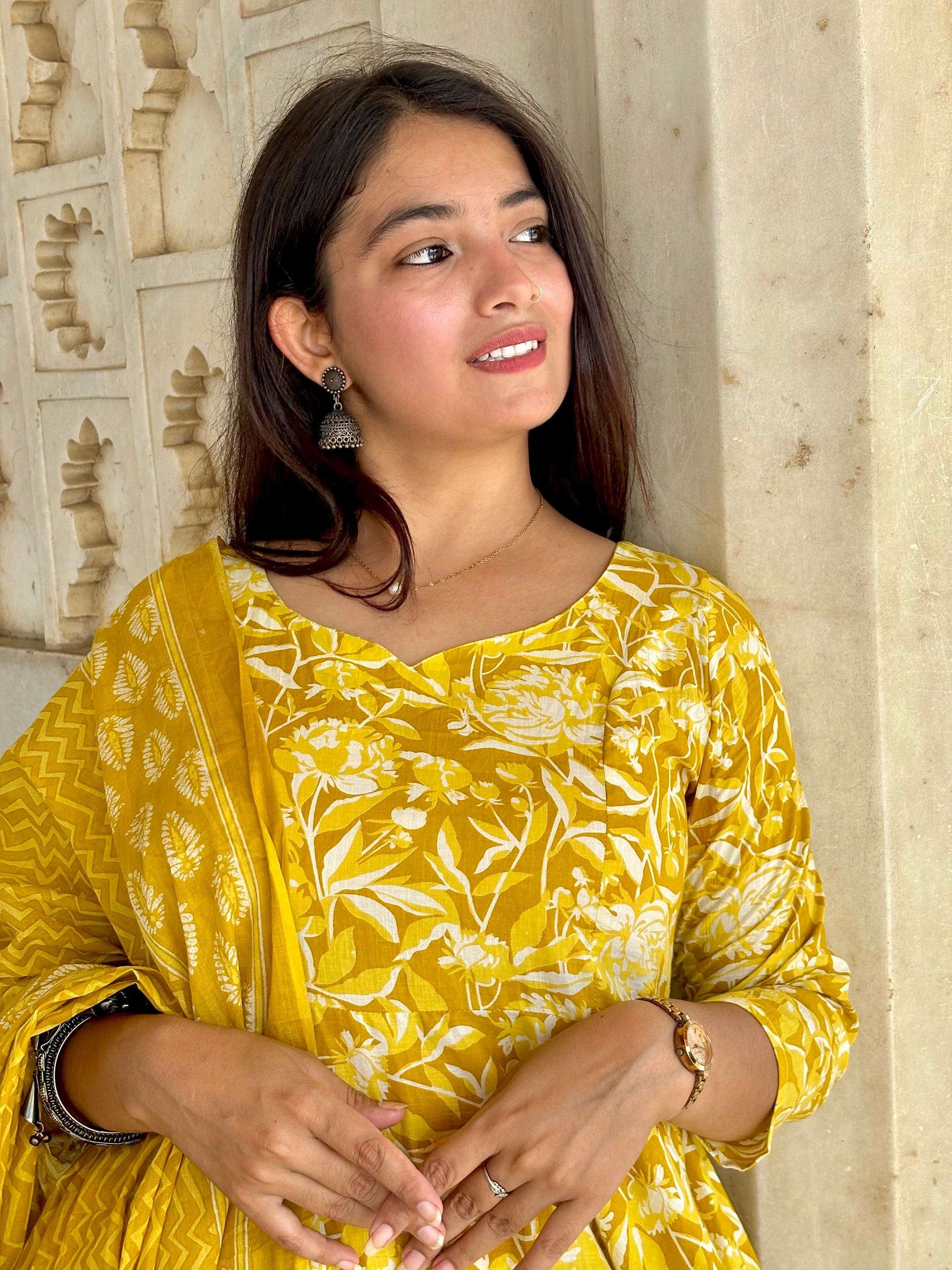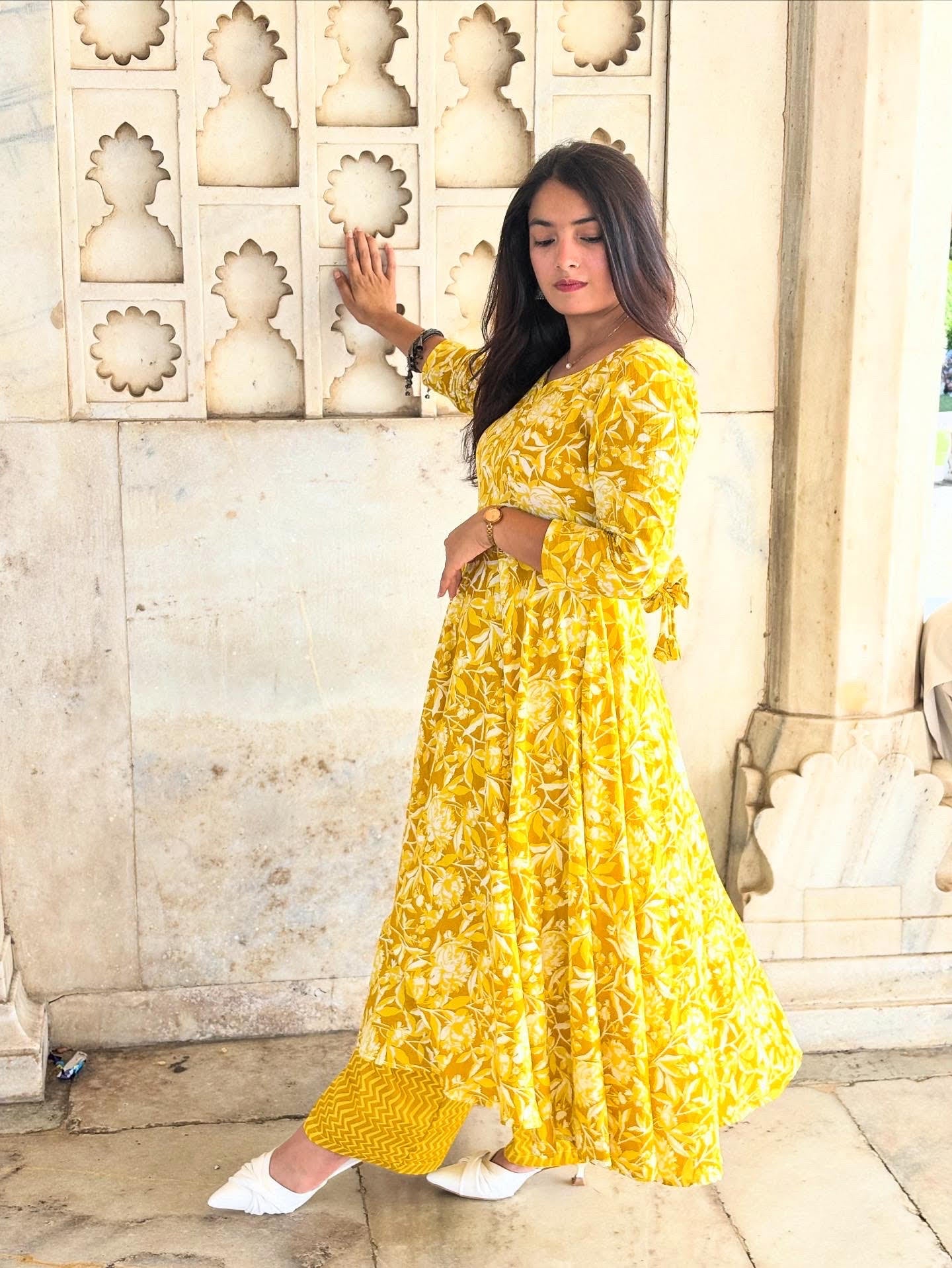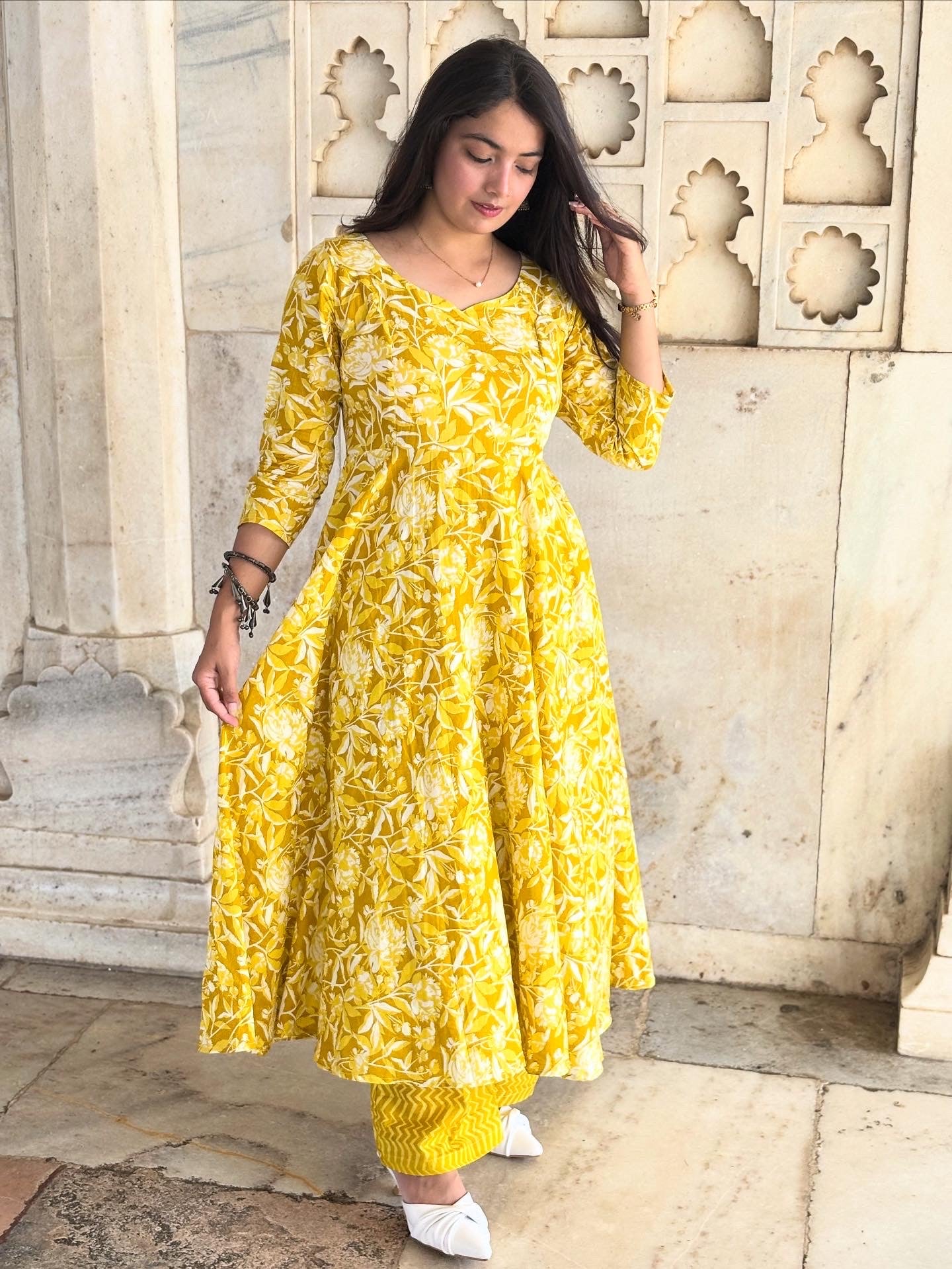 Mahak – A graceful 3-piece set featuring a full circular umbrella-style long kurti in cheerful yellow floral print. Tailored from 100% pure breathable cotton, it ensures comfort with elegance. Paired with a straight bottom and a flowy 2.5m dupatta, this ensemble brings together tradition and modern flair, making it perfect for festive gatherings, casual outings, or daytime celebrations.