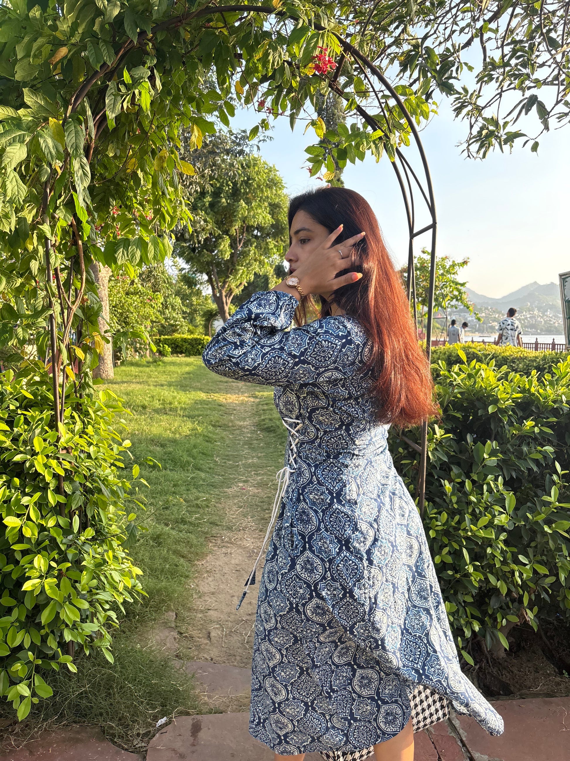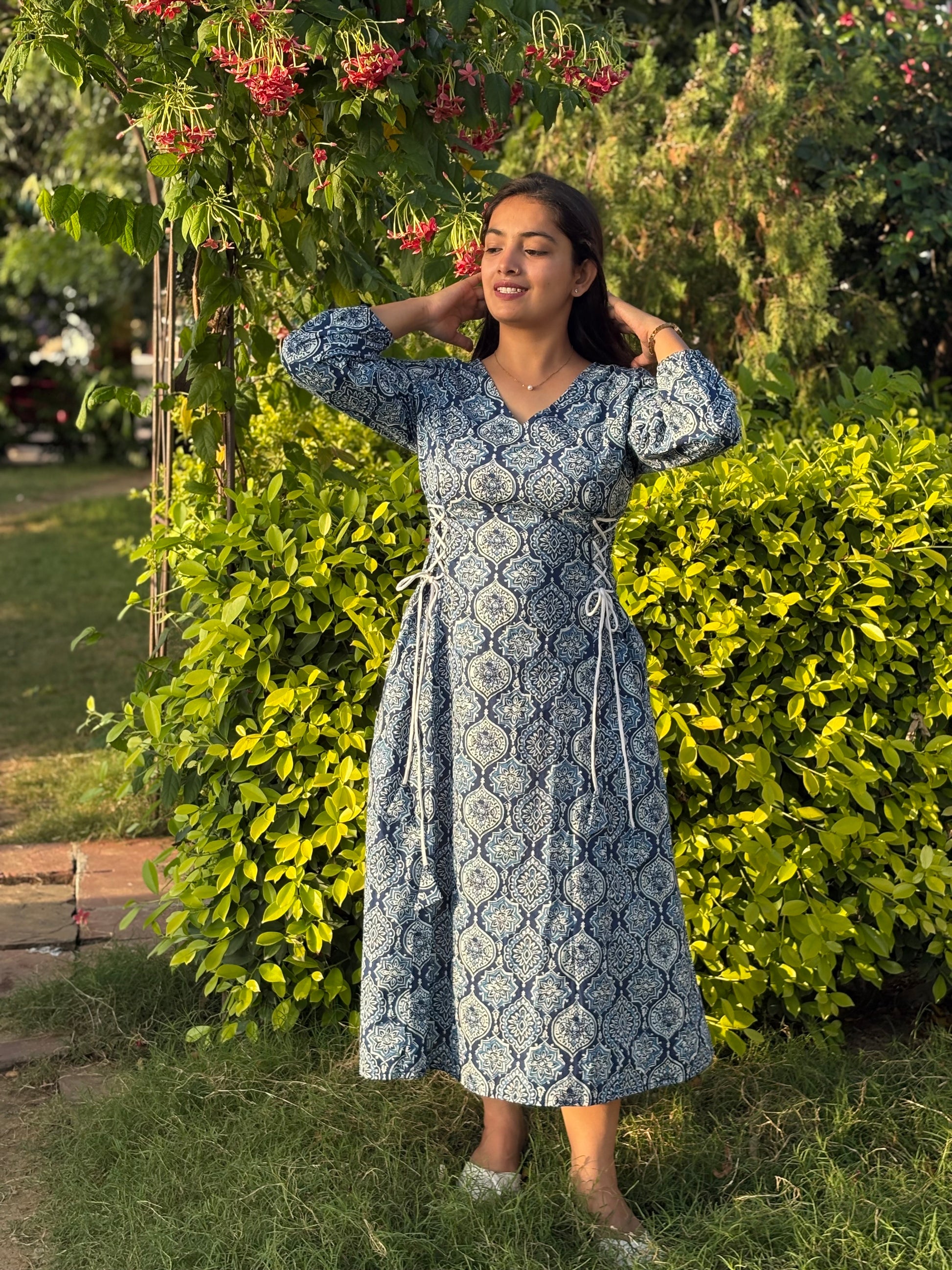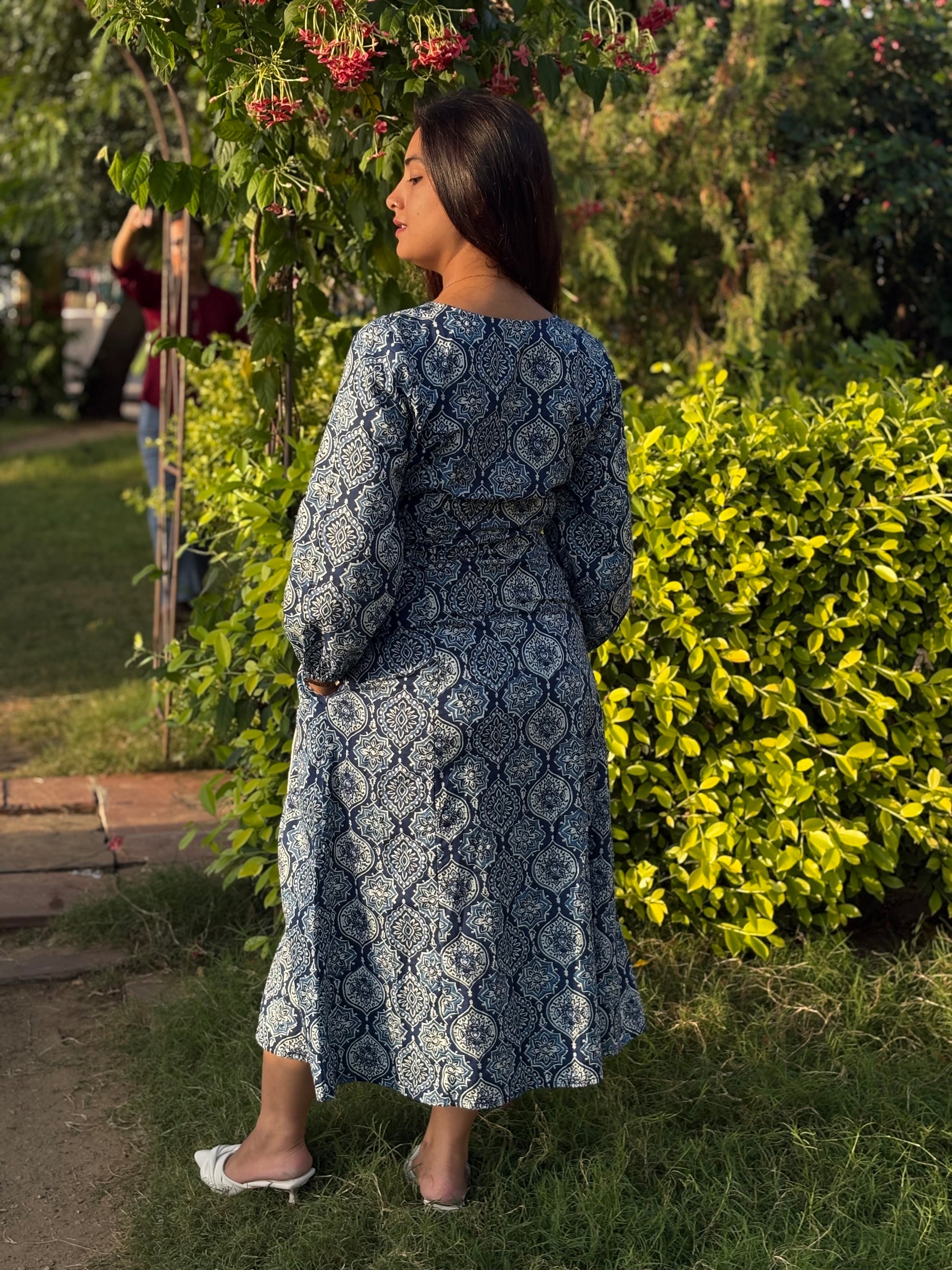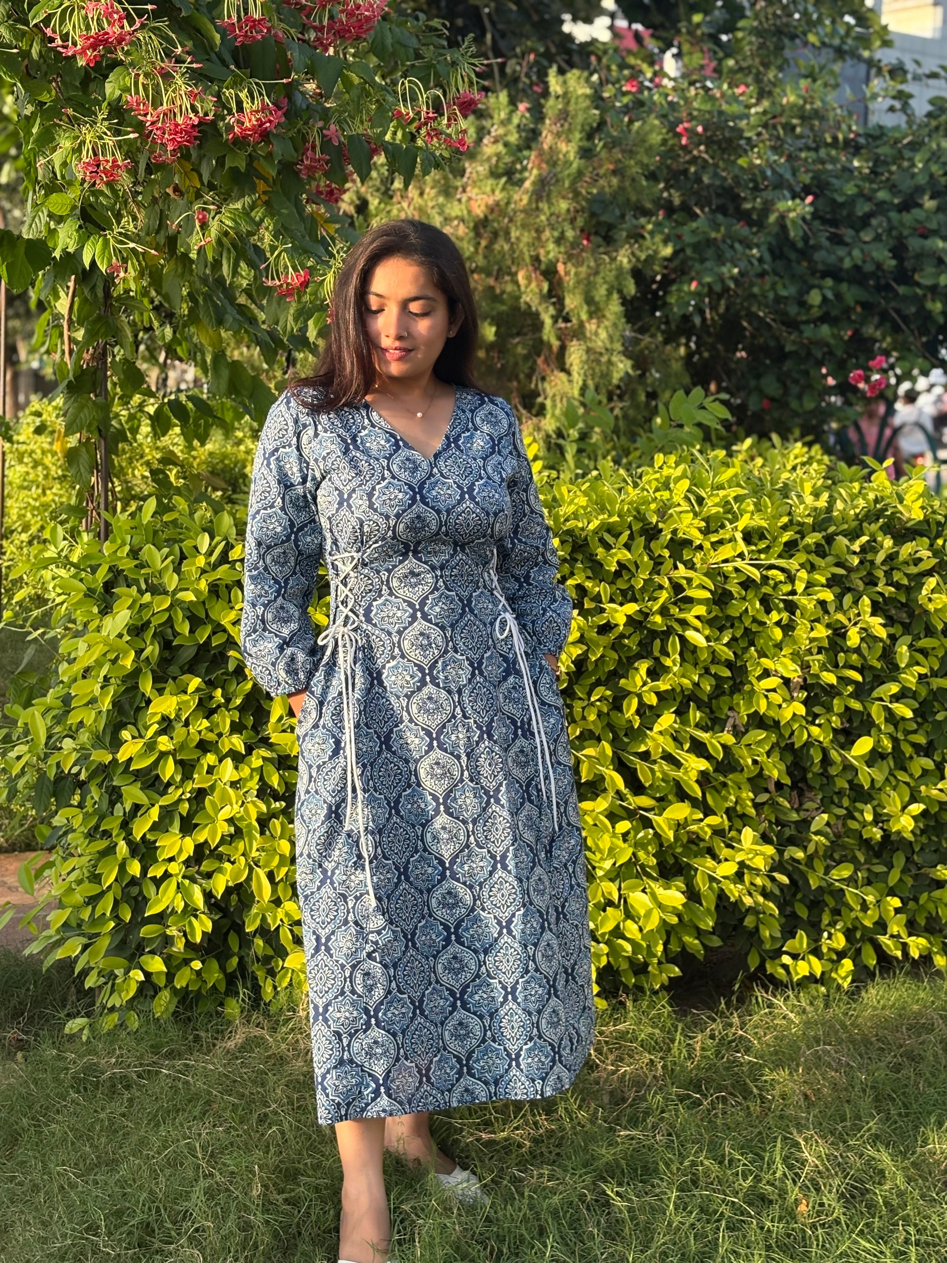 An elegant long dress in timeless Ajrakh print, crafted from 100% pure breathable cotton. Featuring a flattering V-neckline and ¾th sleeves, it combines comfort with ethnic charm. The adjustable waist strings allow a perfect fit, enhancing the flowy silhouette. A versatile piece, ideal for casual outings, festive gatherings, or everyday elegance.