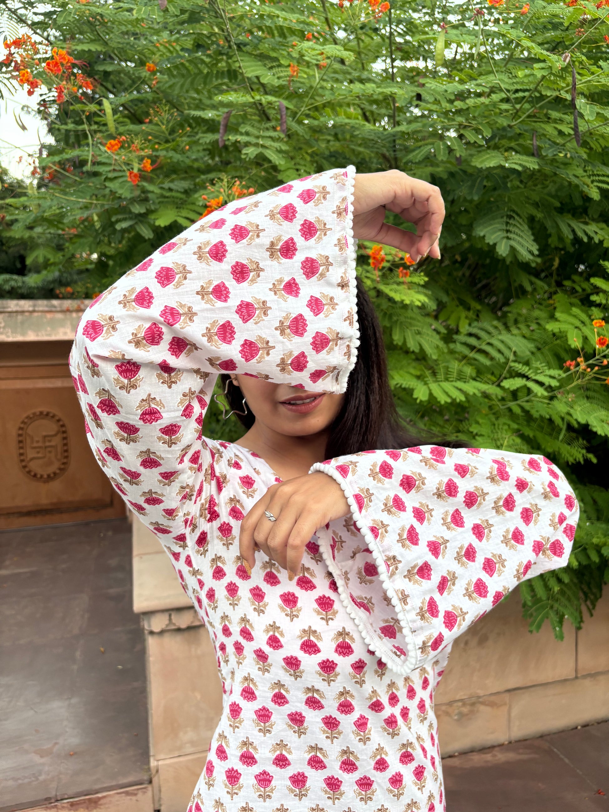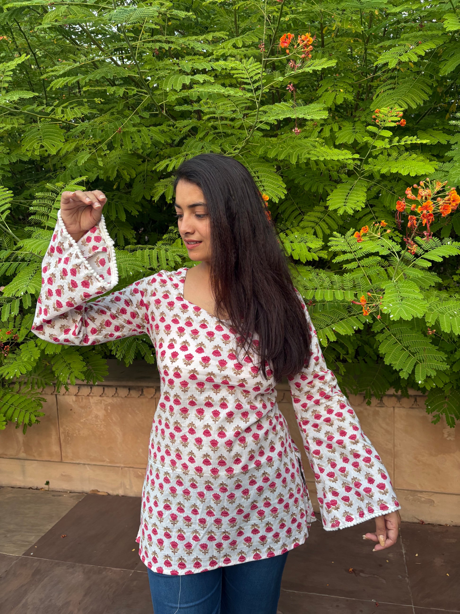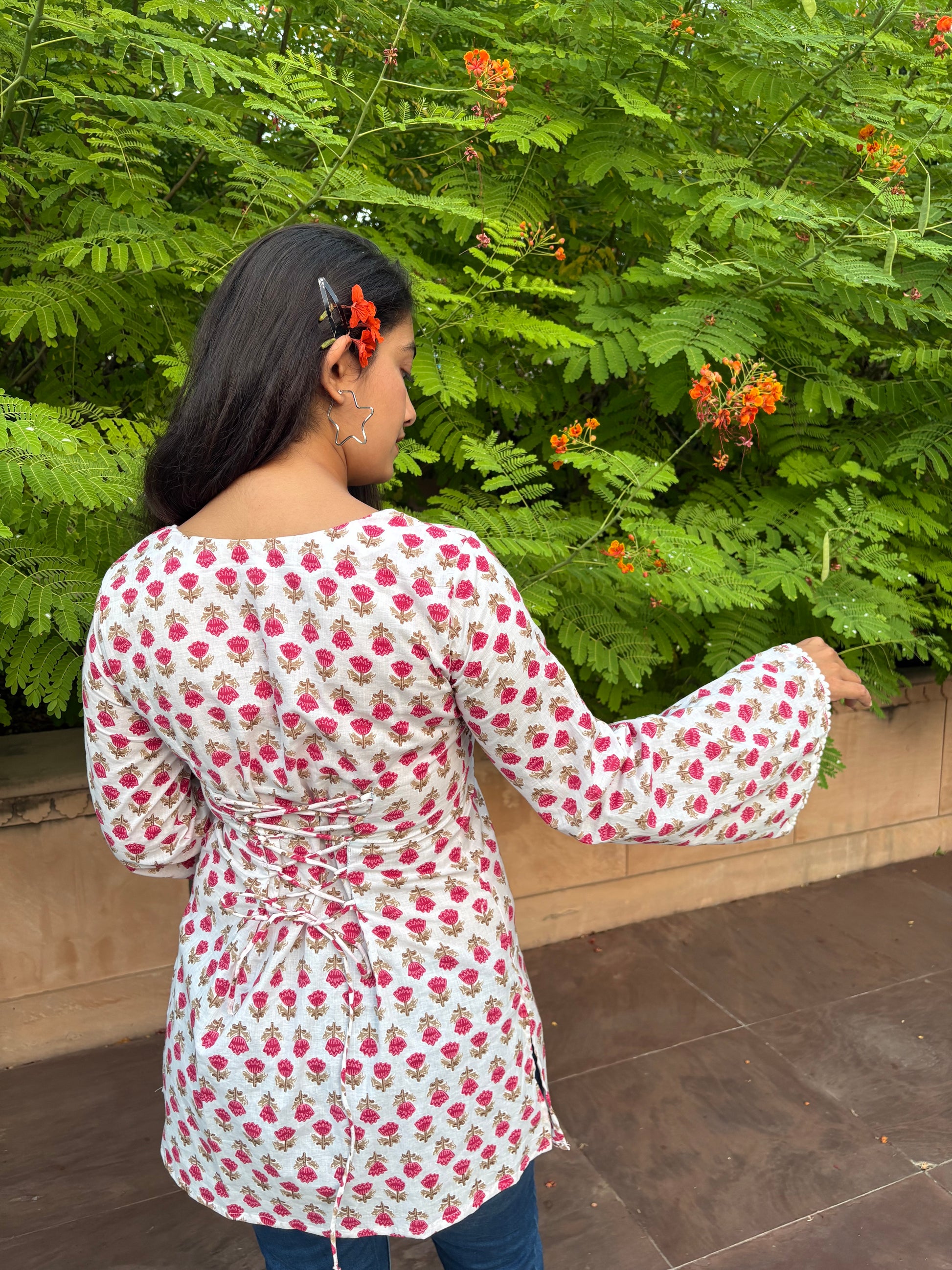 Crafted from 100% pure cotton, this elegant white short kurti blends comfort with style. Designed with statement long bell sleeves and a unique back corset detail, it adds a modern twist to a timeless silhouette. The breathable fabric makes it perfect for all-day wear, while the chic design ensures you stand out effortlessly. Ideal for both casual outings and festive pairings.