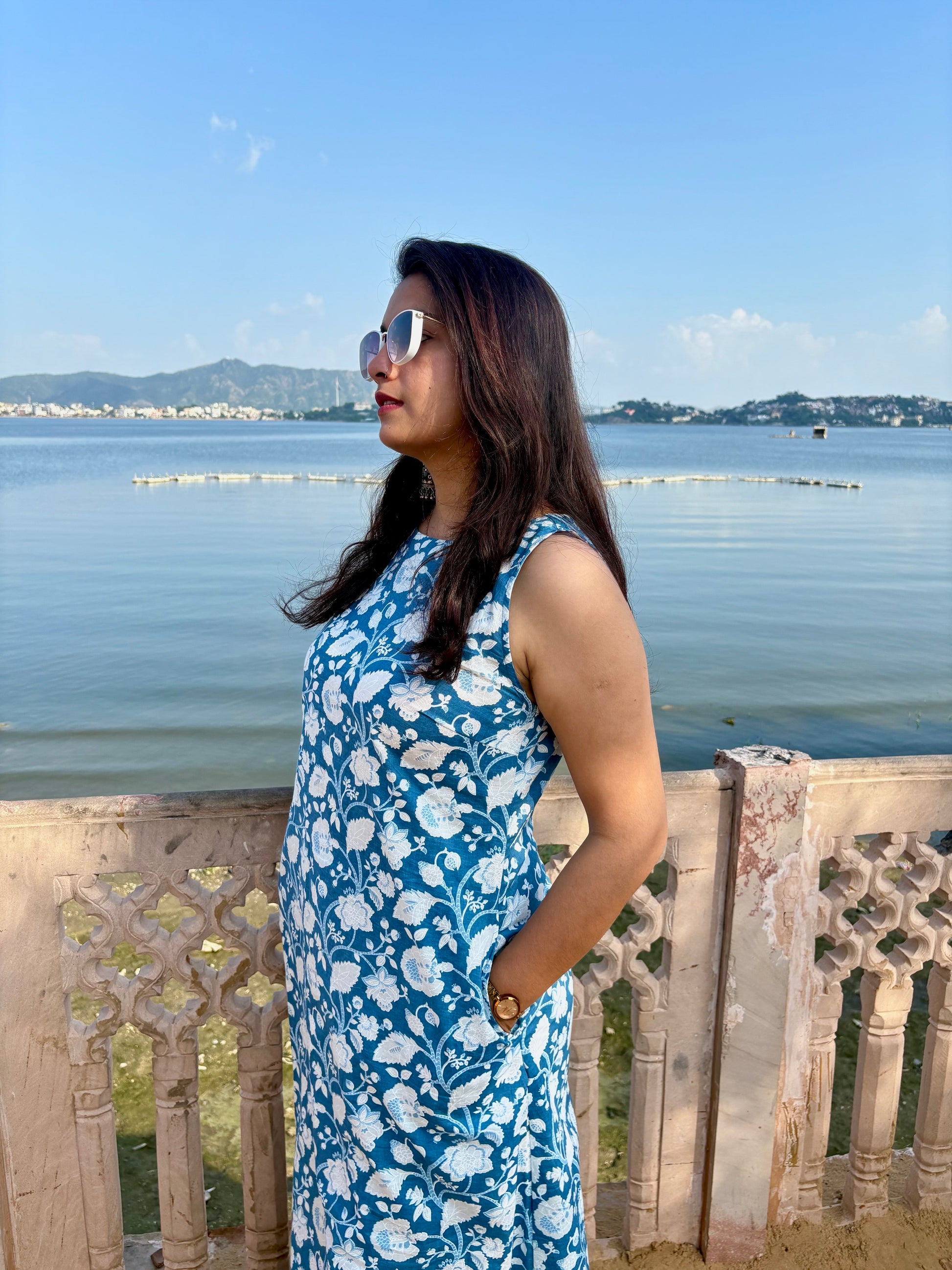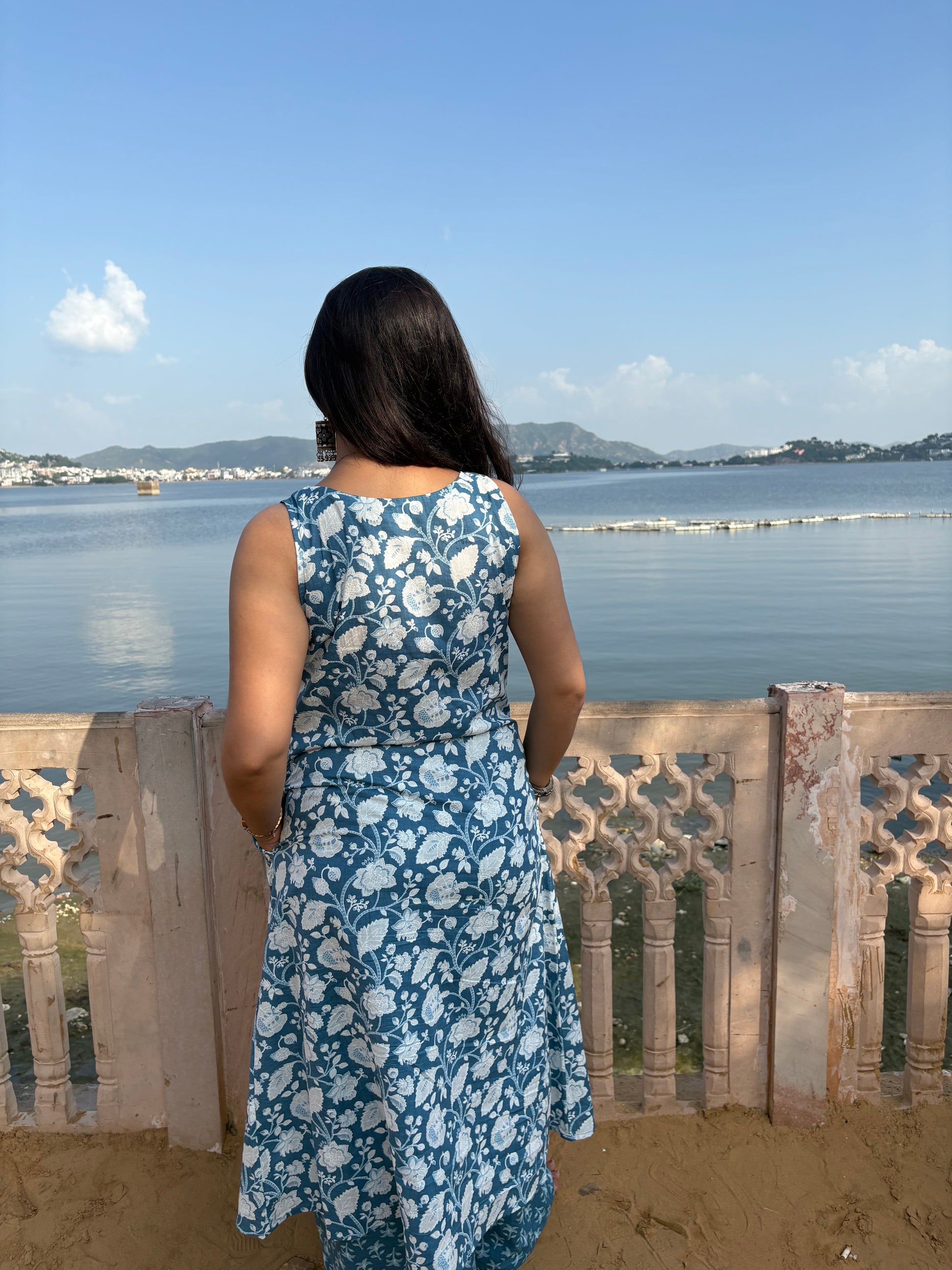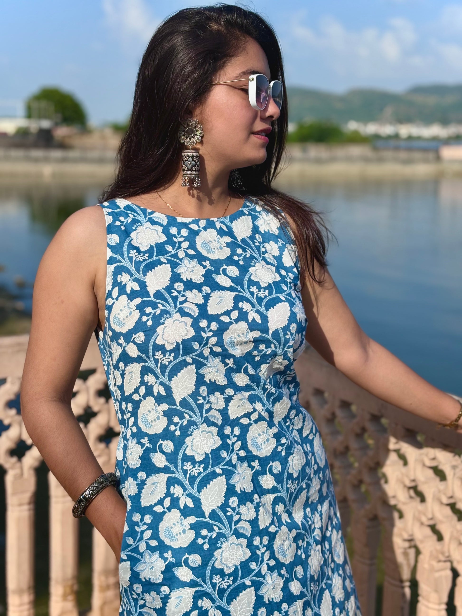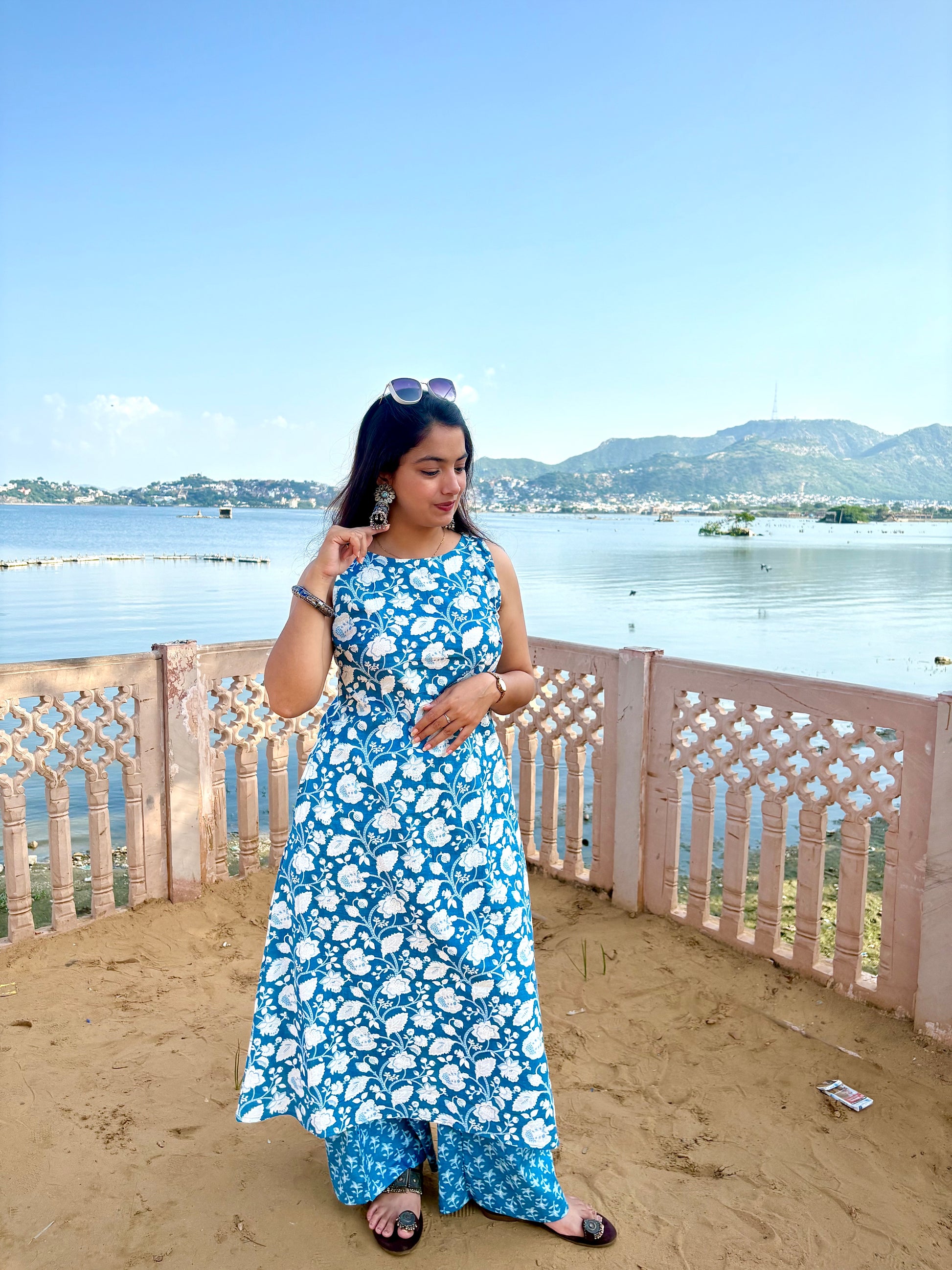 A chic and breezy top-bottom set in calming blue, crafted from 100% pure breathable cotton. The round-neck, sleeveless A-line kurti offers a graceful flow, paired perfectly with a comfortable bottom for an effortlessly stylish look. Light, airy, and versatile, this set is ideal for casual outings, summer wear, or everyday elegance.